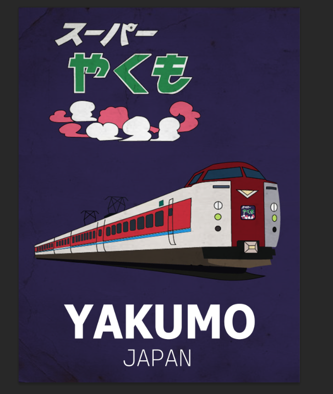Pour approfondir mon apprentissage du logiciel Illustrator, j’ai réalisé une affiche publicitaire dans un style années 80. J’ai choisi de rendre hommage à un train japonais des années 70-80, le Super Yakumo. J’ai repris le logo utilisé par la compagnie de train de l’époque dans mon affiche. Cette affiche m’a permis de mêler le dessin vectoriel d’un train et la réalisation d’un logo en même temps. Cet exercice m’a permis de me rendre compte des différences entre dessin vectoriel et dessin matriciel, comme j’en avais plus l’habitude.
