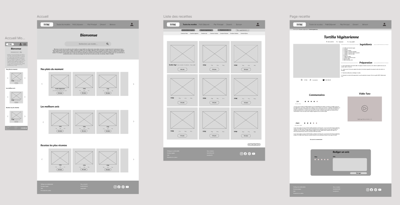 Lors de nombreux projets étudiants, j’ai dû réaliser des wireframes et des maquettes de site web. Pour j’ai appris à me servir de Figma. La création d’un wireframe est la première étape de conception, cela demande une compréhension de ce que l’on veut trouver sur notre page web et comment l’intégrer. Tout cela en respectant des règles d’accessibilité pour que notre page web soit facile à comprendre pour n’importe quel utilisateur. Ici ce wireframe a été conçu pour un site de recettes de cuisine, on peut trouver la page d’accueil, version desktop et mobile. Mais aussi une page où s’affichent toutes les recettes et où l’utilisateur va pouvoir filtrer les recettes en fonction de ce qu’il recherche, et enfin une page recette avec la recette, une image et une vidéo, des avis et la possibilité pour un utilisateur de commenter et laisser une note.